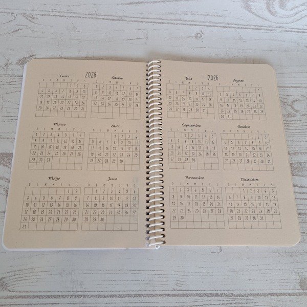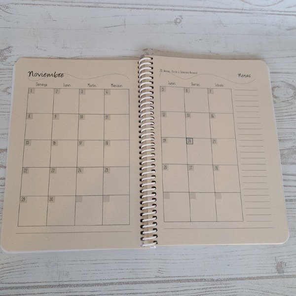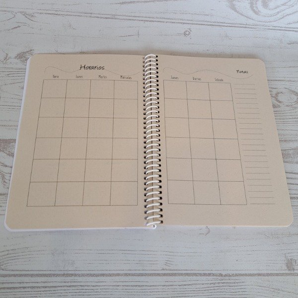 Contiene 1 planificador por cada mes, hoja de datos personales, calendario, horarios y muchas hojas rayadas.